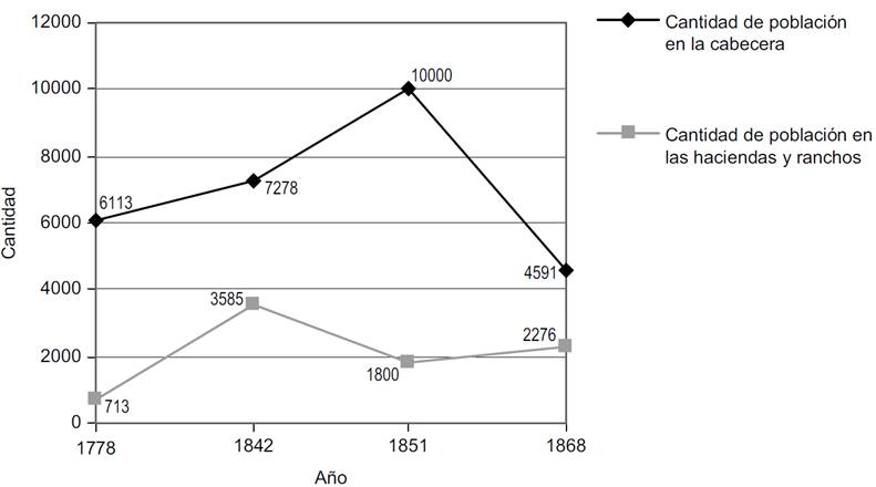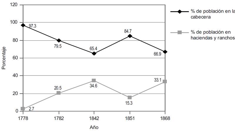Ahora bien, los datos proporcionados por Fernando José Ortiz en el censo de 1851 parecen contradecir las anteriores observaciones. En comparación con la población total registrada por la parroquia de San Bartolomé en 1842 (11 133), los últimos diez años vieron una tasa anual de crecimiento de apenas 0.6% (llegando a 11 800). Adicionalmente, el número de haciendas y ranchos parece haber caído de una treintena a veintiséis. Este último aspecto tuvo su expresión en la disminución de la proporción de habitantes en los campos (de 34.6 a 15.3%) frente al aumento de los residentes en la cabecera (de 65.4 a 84.7%) (gráficas 1 y 2).