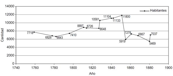 El mínimo crecimiento de esta localidad es todavía más acentuado en la segunda mitad del siglo XIX, cuando la segregación de La Concordia -incluyendo a sus fincas circundantes- y los variados brotes de cólera que se presentaron hicieron que descendiera a 6 000 personas. En este periodo de tiempo el pueblo difícilmente consiguió superar de nuevo los 7 000 habitantes que lo habían caracterizado cien años antes (gráfica 3).