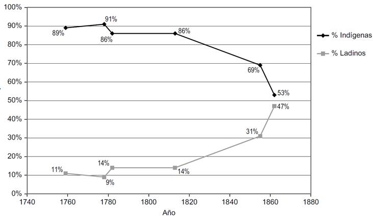 También tenemos indicios de que otro cambio estaba iniciándose a mediados del siglo XIX: se trata de un leve proceso de desindianización. A lo largo de la segunda mitad del siglo XVIII -y por lo menos durante las dos primeras déca das del siguiente- la cantidad tanto de indios como de ladinos en el pueblo de San Bartolomé, pese a las epidemias, aumentó constantemente y sus porcentajes representativos giraron en torno a 90 y a 10% respectivamente. A mediados del siglo XIX -de casualidad, luego de ser creada La Concordia- por vez primera el porcentaje de población no indígena llegó a superar el 30%, casi alcanzando a reunir a 2 000 personas. Apenas una década más tarde, empezó a delinearse un nuevo perfil de la parroquia de San Bartolomé, el cual definía claramente una mitad de población como ladina y la otra restante como indígena (gráficas 5 y 6).