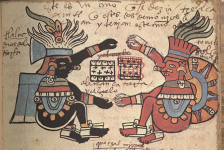 | Ic cempoalli oncaxtolli oce capitulo, vncan mjtoa: in quenjn tetaoan, tenanoan, qujnnotzaia in tonalpouhque, in tlamatinjme: injc qujtoaia in quenamj itonal catca, in otlacat piltontli: qujttaia in quenamj tonalli ipan otlacat. Auh in iehoantin tonalpouhque: achto vel ic tlatlanja, in quenman vel otlacat piltontli: in cujx aiamo vel iooalnepantla: ic itech qujpoaia in tonalli, î cemjlvitlapoali, in oqujz. Auh intla oqujz iooalnepantla, tlacatia: itech qujpoaia in tonalli, î cemjlvitlapoalli, in oallatoqujlia: auh intla vel iooalli ixelivian tlacatia: necoc qujpoaia in tonalli. Auh njman qujttaia in jmamux: vncan qujttaia, in quenamj imaceoal piltontli: in cujx qualli, in cujx noço amo: in juh catca itoloca î cemjlvitlapoalli: in jpan otlacat.* | Capítulo 36 De cómo los padres de la criatura hazían llamar a los adivinos para que dixessen la fortuna o ventura que consigo traía la criatura, según el signo en que havía nacido, los cuales venidos preguntavan con diligencia la hora en que havía nacido. Y si havía nacido antes de la medianoche, atribuíanle al signo del día pasado; y si havía nacido después de la medianoche, atribuíanle al signo del dia siguiente; y si havía nacido en la medianoche, atribuíanle a ambos signos. Y luego miravan sus libros, y prenosticávanle su ventura, buena o mala, según la calidad del signo en que havía nacido. (Sahagún -traducción no literal-) |