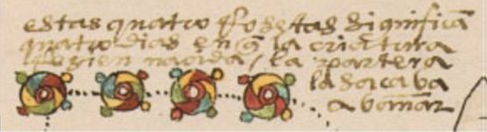 | Inin nauhteme xiuhtonaltin, xiuhtlapoaltin: izquiteme ceceppa moquetztiui, tonalpeuhcaiome muchiuhtiuj.* | Ansí que cada una de las dichas cuatro figuras por la dicha orden, de treze en treze años, comiençan la cuenta de los años. (Sahagún -traducción no literal-). |