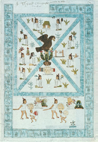 | Vida religiosa. | Uei tecuílhuitl: Davan de comer a hombres y mugeres, chicos y grandes, ocho días continos antes de la fiesta. (Sahagún, hg, ii, 8, 88). |