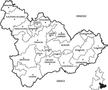 Mapa 1 Sureste del estado de Puebla. Marcado con el número 1, se puede ver el municipio de Tlacotepec de Díaz.