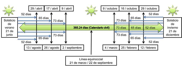 La descripción de la clasificación de las fechas de los alineamientos astronómicos relacionados con el calendario (figura 2) de las tres principales familias es la siguiente: