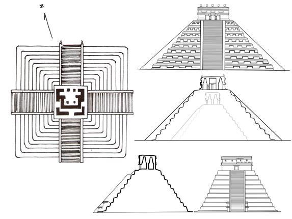 Manuel Cirerol y Enrique Juan Palacios, a quienes se sumó José Erosa Peniche, usaron el mismo enfoque en la subestructura hallada en El Castillo (figura 4), pero se encontraron con que esta solo contenía una escalinata en la dirección norte. No obstante, en el conteo de sus peldaños dio un total de 63, los cuales relacionaron con el ciclo de 819 días que mencionaba Thompson en años pasados, haciendo la relación de múltiplos en 13 días del calendario sagrado de 260 días (Erosa 1939, 230, 231; Palacios 1945, 372).