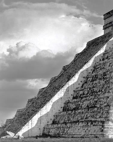 La siguiente década no ofreció mucho en términos de aportaciones arqueoastronómicas en el sitio, salvo la llegada en 1932 de una fotógrafa de nombre Laura Gliphin, la cual venía recorriendo con su cámara fotográfica varios sitios arqueológicos desde el sur estadounidense y norte mexicano hasta que llegó al sureste de México, donde transcurrió un poco más de tiempo del previsto. Entre sus fotografías, destaca una secuencia en Chichén Itzá, de la cual sobresale el costado norponiente de la alfarda El Castillo, con un juego de luces y sombras de triángulos isósceles que rematan en la cabeza de serpiente ubicada en su base (figura 5).