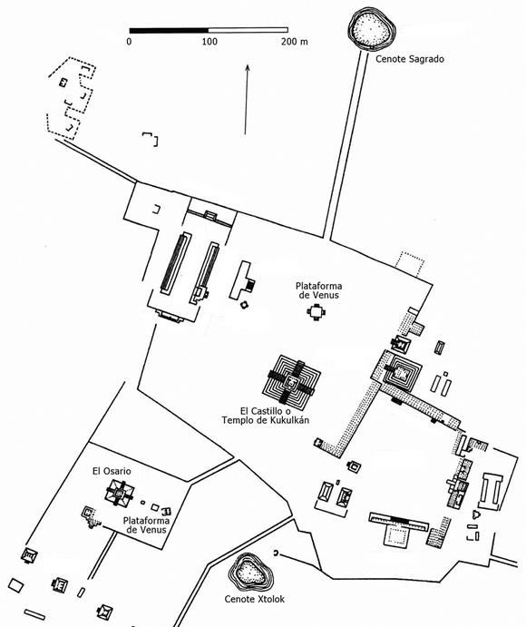 Figura 6 Mapa de Chichén Itzá, nótese el patrón urbanístico de pirámide-calzada-cenote repetido.
