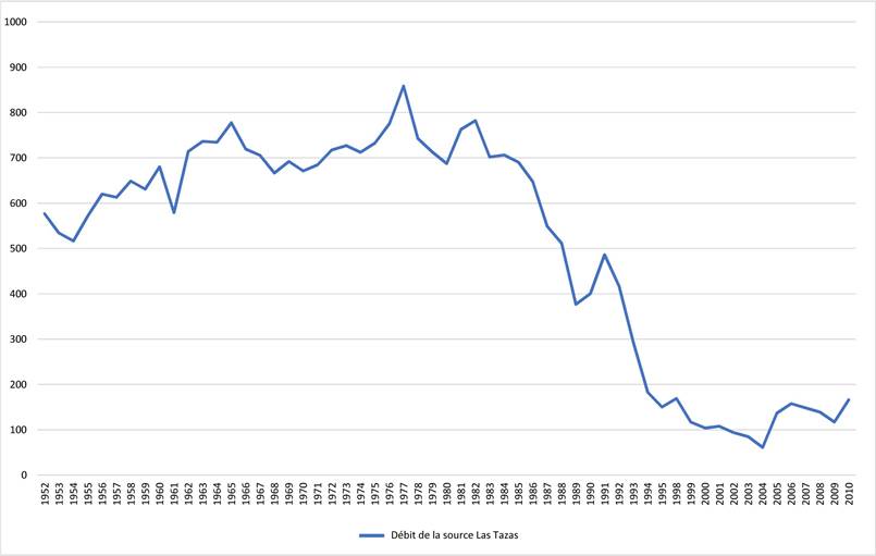 Au début des années 1990, les sources qui alimentent le réseau d’eau potable de la zone centre de Cuautla ne satisfaisaient plus les besoins en eau de la population et des commerces existants. Pour tenter de résoudre le problème, le Système d’Eau Potable et d’Assainissement de Cuautla (SOAPSC)21 procède en 1993 à la perforation d’un forage profond sur un terrain que les autorités municipales ont acheté à l’ejido Santa Inés22. L’organisme de l’eau municipal, qui n’a pas encore obtenu l’autorisation de la CONAGUA pour perforer le captage, touche les veines de la source Las Tazas, entraînant la baisse immédiate et subite de son débit (cf. figure 5). Celui-ci passe de 418 litres par seconde en 1992 à 293 litres en 199323. Les usagers constatent rapidement le tarissement de la source et après avoir identifié que le problème est lié à la perforation du captage, ils exigent aux autorités de réintégrer l’eau du captage dans le canal pour pouvoir continuer à irriguer leurs cultures.