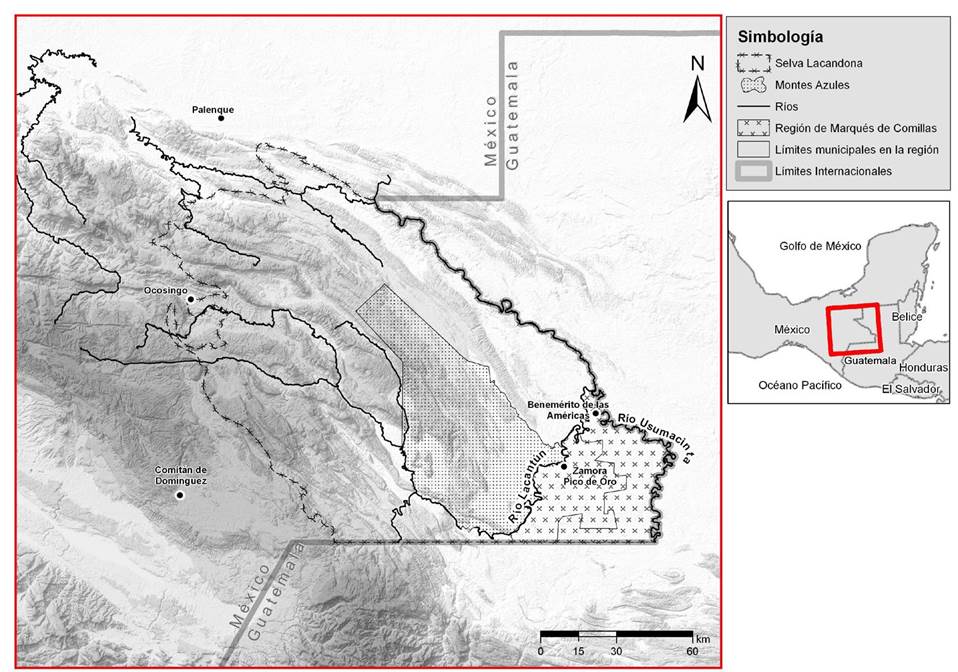 Este artículo evidencia tal tendencia, centrando la atención en la región de frontera conocida con el nombre de Marqués de Comillas, ubicada entre los ríos Lacantún y Usumacinta, y delimitada al sur por el Vértice de Santiago, o línea recta que separa, en el sureste, a Chiapas de los departamentos guatemaltecos de El Quiché y Huehuetenango (véase fig. 1). Se trata de una extensión de aproximadamente doscientas mil hectáreas, fuente de disputas internacionales a finales del siglo XIX, con una historia larga de ciclos extractivos1 hasta el presente, pero también con una particular historia de colonización desde mediados del siglo XX y con una posición estratégica, desde el año de 1978, para el amortiguamiento ecológico de la Reserva de la Biósfera Montes Azules (Rebima).
