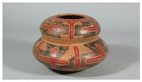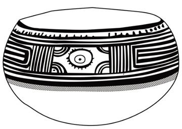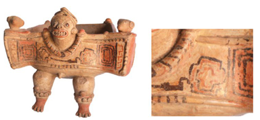 Figura 16 Ejemplos de cruces concéntricas en objetos arqueológicos. Escudilla trípode con diseño de hombre murciélago, Pacífico Norte, 300-800 d. C., 20.5 x 24.5 cm, Colección Museo Nacional de Costa Rica (MNCR 23040).