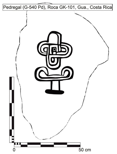 En el Pedregal, a pesar de la proximidad (2 km de Las Yegüitas), no se conoce un ejemplo de cruz concéntrica. De hecho, las cruces son escasas en comparación con los cientos de grabados registrados. Solo otro motivo de cruz aparece en dos rocas, que consiste en dos óvalos cruzados enredados (véase la fig. 19). Aunque es un diseño escaso, se reconoce en figuras femeninas del tipo Galo policromo del periodo Bagaces (Seigne 2023), contemporáneo a las cruces concéntricas de Las Yegüitas. Sin embargo, las cruces se repiten en las rodillas y los hombros de las figurinas, lo que parece descartar una relación con la fertilidad o el nacimiento. También se conoce en un colgante de jade contemporáneo del Museo del Jade (Novoa Espinoza 2016, 135).