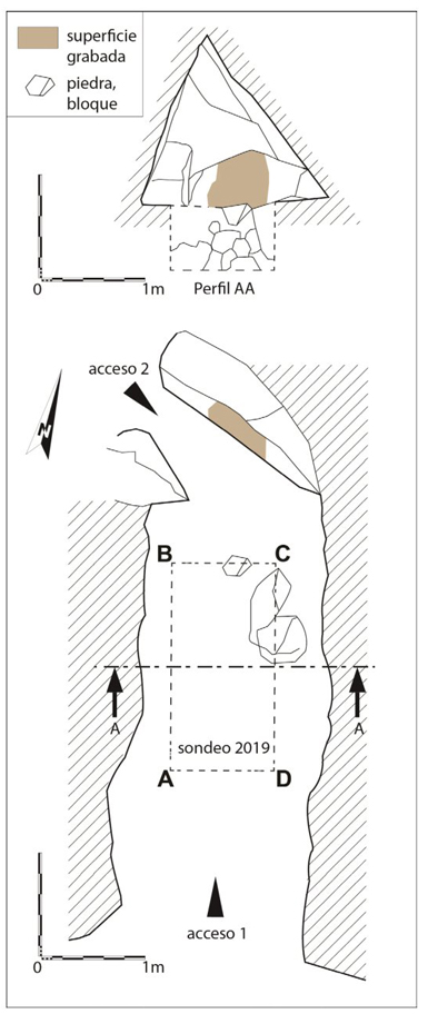 Dentro de las investigaciones desarrolladas en este abrigo rocoso se llevó a cabo un sondeo arqueológico que se describe a continuación.