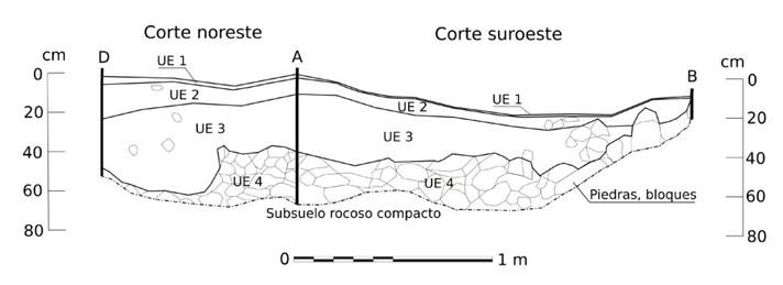 Según términos geomorfológicos, la capa humífera de la excavación fue heterogénea (N1, UE0) con presencia de perturbación vegetal (raíces) y erosiones naturales en el N1 (UE2, transición UE3).