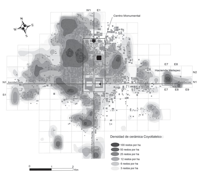 Hacienda Metepec constituye un excelente laboratorio para explorar este periodo de transición debido a su larga secuencia ocupacional. La evidencia cerámica indica que tuvo una ocupación continua (o casi continua) por más de mil años, desde 150 a. C. aproximadamente. El periodo Epiclásico (600-850 d. C.) es un momento de interés particular para la investigación del PHM. El Epiclásico corresponde al periodo inmediatamente posterior al colapso del Estado, cuando el barrio de Hacienda Metepec se volvió uno de los sectores más densamente ocupados de la ciudad (Cowgill 2015; Rattray 1980), tal y como se presenta en la figura 2. Durante el Epiclásico, los ocupantes del barrio usaban un nuevo complejo cerámico conocido como Coyotlatelco. La identidad étnica de estos grupos (extranjeros o descendientes de las poblaciones teotihuacanas previas) sigue siendo un tema de debate (Moragas Segura 2013; Solar Valverde 2006).