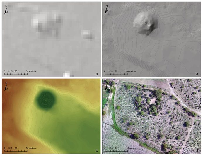 La combinación de la información del terreno y de teledetección ofrece una visión más detallada de la zona y de sus características. Sin embargo, la resolución de los datos, tanto de los proyectos anteriores como de los proporcionados por el INEGI, no es suficiente para explorar las características microtopográficas de Hacienda Metepec y para reevaluar su organización. Es por ello que en junio de 2022 realizamos un levantamiento topográfico de alta resolución con una estación total. La vegetación de nopales y árboles en el sitio no permitió seguir la cuadrícula de manera perfecta y muchos puntos fueron tomados en lugar más accesibles (p. ej., brechas) para el paso de la señal láser. Este levantamiento se concentró en el núcleo monumental del barrio, es decir, un área de 3.68 ha y un total de 459 puntos tomados. El proceso incluyó la combinación de la nube de puntos obtenida en campo con los datos retomados del MDE del INEGI (véase fig. 5a), que sirvieron como complemento para la obtención de un nuevo MDE a 1 m de resolución (véase fig. 5b). Este juego de datos raster evolucionará verosímilmente a lo largo del proyecto de campo y la obtención de una nube de puntos más densa que abarque toda la zona de interés. Los datos obtenidos e integrados al SIG generaron varios tipos de visualizaciones, como un hillshade, con curvas de nivel a 0.25, 0.50 y 1 m (véase fig. 5b-c). Esto permite observar la microtopografía del lugar e identificar cambios en las elevaciones, para así volver a evaluar el terreno y los sectores con un alto potencial de contener vestigios arquitectónicos.