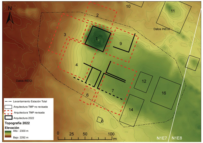 Si bien Rattray no ubicó los muros perimetrales del complejo, su ubicación general por el TMP parece adecuada. En la figura 6 se observa el levantamiento con estación total, en el que se identifica un cambio de nivel dentro de la plataforma monumental, con un espacio alto presente en la parte este de la plataforma, empezando al este y sur de 9:N1E7 y continuo hasta el posible conjunto 16:N1E7, ubicado al este. Tal cambio topográfico representa una alteración de nivel de 2.5 m entre el pie de la pirámide y la ubicación propuesta del conjunto 7:N1E7. Este espacio alto incluye potencialmente vestigios de 7:N1E7, 12:N1E7, 14:N1E7 y 16:N1E7. Si bien los límites entre estos cuatro conjuntos quedan sin confirmar (con base en nuestros datos), sí se percibe la presencia de vestigios subterráneos extensos y de una planta relativamente cuadrada.