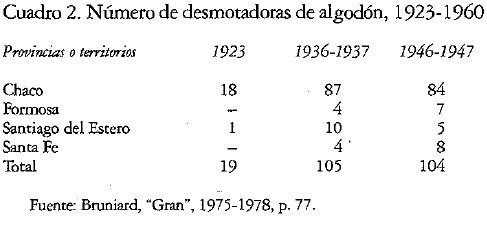 El cultivo del algodón está ligado a los inicios de la ocupación hispánica del nordeste del territorio, pero su extensión decrece con la llegada del ferrocarril, la organización del mercado interno y los vínculos del consumo argentino con las manufacturas y capitales internacionales en el siglo XIX.22 En esa región con varios territorios nacionales (Chaco, Formosa, Misiones) con numerosa población indígena y en consecuencia sin una fuerte burguesía local arraigada, alejada del eje metropolitano y ante la necesidad de formar parte del Estado y el mercado nacional, que se estructuran hacia 1880, la explotación forestal del quebracho taninero que puebla los bosques del nordeste argentino (NEA) se convierte en la alternativa no competitiva con los productos (cereales y ganadería de alta mestización) de otras regiones más cercanas al puerto de Buenos Aires, que el modelo económico se propone consolidar. El propósito esencial de quienes gobiernan el territorio es formar parte de la Argentina agro-exportadora impulsada por la llamada Generación del 80, como expresión del positivismo y "el progreso indefinido".