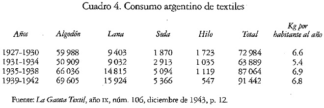 A mediados de la década de los cuarenta, con una superficie sembrada de 381 914 hectáreas, la República Argentina figura entre los diez primeros países productores de algodón, aunque con apenas 1% de la producción internacional. 64% de esa producción (unas 56 000 de las 72 350 ton anuales) es empleado en la industria nacional de hilados y tejidos de algodón.38 Un nuevo convenio entre los hilanderos de algodón del país pretende, una vez más,