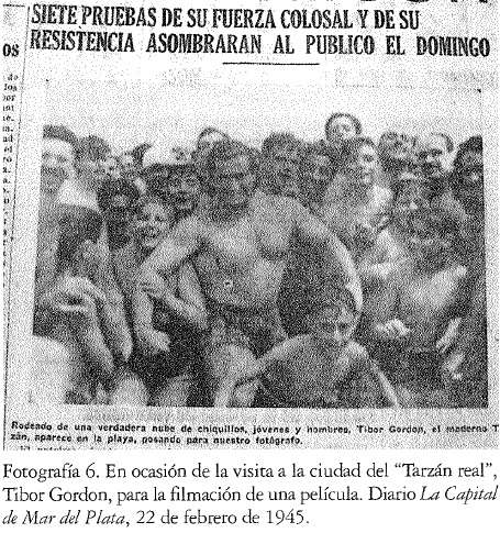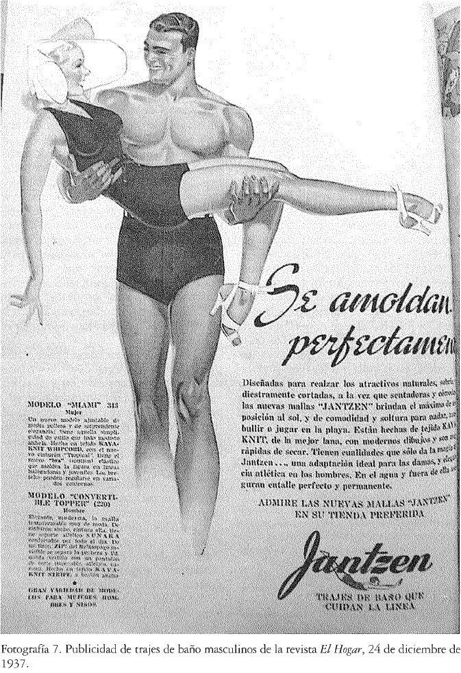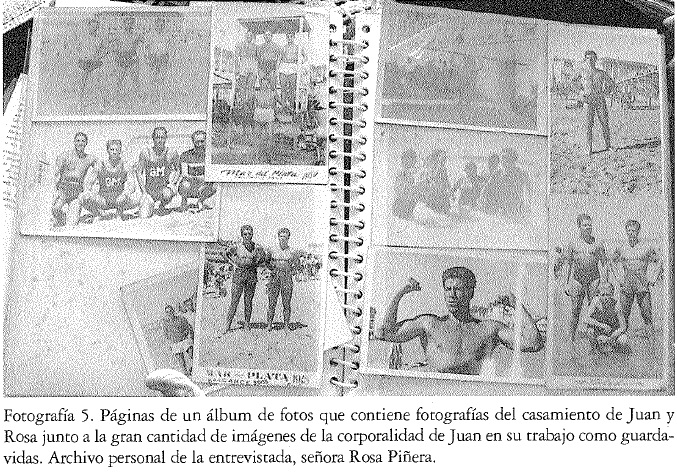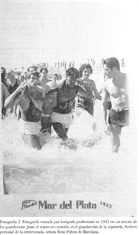 Las situaciones de toma pueden reconstruirse a través de un montaje de los registros visuales de la época. Además de la centralidad que poseen las entrevistas como un medio para acceder a aquellas prácticas pasadas, los repertorios visuales de más amplia circulación constituyen un modo de leer las situaciones y el significado de tomarse fotografías. En el análisis de un caso particular, las fotografías pertenecientes a un guardavidas durante los años cuarenta en Mar del Plata, fue trabajado cómo la importancia del acto de tomarse fotografías en la playa, con traje de baño y desplegando la musculatura corporal, se relacionaba con estereotipos masculinos que circulaban en la prensa, los consejeros de salud y el cine.37 Juan, el protagonista de las imágenes, poseía un centenar de fotografías que habían sido tomadas a comienzos de la década de 1940 por fotógrafos profesionales que trabajaban en las playas de Mar del Plata, una ciudad balneario. Su esposa (a quien entrevistamos) las había conservado y les daba un gran valor afectivo. Una característica de estas fotografías era la exaltación del cuerpo de Juan y en particular de su imponente musculatura pectoral y la valentía que implicaba el trabajo de guardavidas. La perspectiva del encuadre, las poses de Juan, su mirada a la cámara, las situaciones de acción y el grupo de pares eran recursos que los fotógrafos utilizaron para enaltecer esa figura. Durante el análisis de este caso, en el cual estaban involucrados varios hombres, nos preguntamos por el estereotipo de masculinidad con el cual coexistían estas imágenes. Pudimos ver, rastreando otras imágenes y sentidos de la época de tener un cuerpo fuerte y saludable, la relevancia en los años cuarenta de la idea del hombre trabajador que se construye a sí mismo a través del trabajo sobre su cuerpo. La amplitud de la caja torácica era la sinécdoque de ese estereotipo de masculinidad que Juan representaba (véanse fotografías 2-7).(3, 4, 5 ,6)