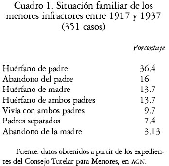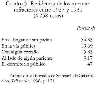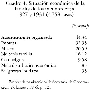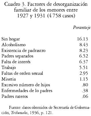 Por otro lado, la mayoría de los menores estaba lejos del ideal promovido por los gobiernos posrevolucionarios, muy pocos de ellos vivían con sus padres y se dedicaban exclusivamente al estudio. La mayoría vivía con un solo padre, o en todo caso, con familiares o extraños. Debido a la situación económica ambos padres tenían que trabajar, por lo tanto, eran pocas las madres que se dedican exclusivamente al cuidado de la casa y de los hijos; es decir, no cumplían con el ideal de madres. Esta situación estaba lejos del ideal pero era la realidad de miles de familias pobres de la ciudad de México entre 1920 y 1937. Aunque las fuentes del Tribunal para Menores tenían el objetivo de analizar al niño desde todo los ámbitos para determinar las causas que lo llevaron a delinquir, gracias a estos exámenes y comentarios de los delegados investigadores, muchas veces prejuiciosas, nos adentramos a mundo de problemas que hoy en día continúan.