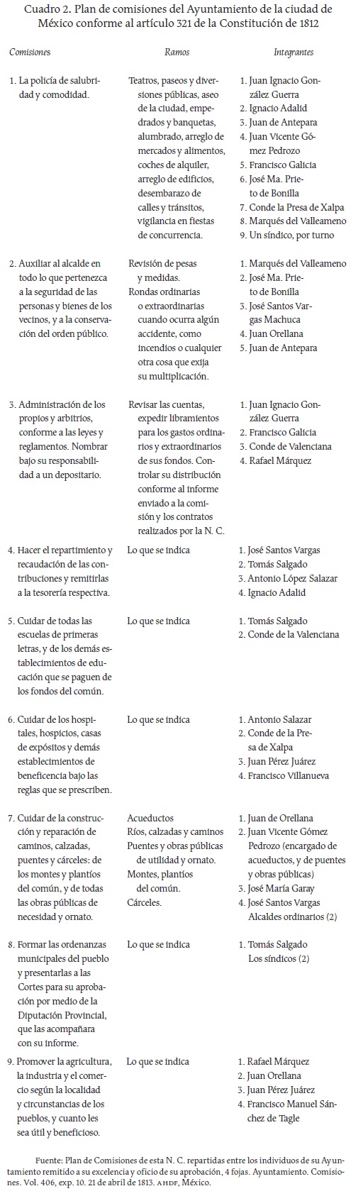 Con la promulgación de la carta gaditana, la facultad de crear ayuntamientos dejó de ser un privilegio real para convertirse en un derecho de las ciudades que contaran con una población mayor a 1 000 habitantes, pero siempre supeditados a la autoridad de las Cortes y de las Diputaciones Provinciales. En 1813 se constituyó el Ayuntamiento constitucional en la ciudad de México. Para realizar las tareas que la carta gaditana señalaba, se reorganizó el Cabildo en comisiones. Esta forma de organización político-administrativa estaba orientada a una nueva noción de los encargos, que se concibieron como temporales y no como una posesión del oficio, tal y como los anteriores regidores lo hicieron. Es decir, debido a que los regidores constitucionales ya no eran dueños del cargo, tampoco estaban en posesión de alguna facultad específica permanente (Mannori y Sordi, 2004, p. 74). Con esto se concretó el proyecto absolutista de disminuir la capacidad jurídica del Cabildo, ya que su tarea quedó acotada a sólo regular y sin la facultad de dictar sentencia debido a que se debían ceñir a un cuerpo legislativo más grande como la Constitución (Fernández, 1993, pp. 284-299).