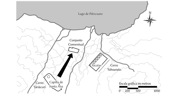 El traslado de la capilla, como ya se dijo, pudo haberse realizado entre 1534, cuando se reconoció a Tzintzuntzan como ciudad de Michoacán, y 1536, año en que quedó como cabecera de la custodia franciscana de San Pedro y San Pablo y como silla del obispado de Michoacán. Se sabe por un testimonio de 1538 que para ese año los frailes tenían poco de haberse mudado (Warren, 1977, p. 440), es decir, se había trasladado de la ladera del cerro Yahuarato hacia la zona baja del Tzintzuntzan. Es probable que también se mudara a esta zona de la ciudad parte de la población que habitaba en las laderas de los cerros Tariácuri y Yahuarato.