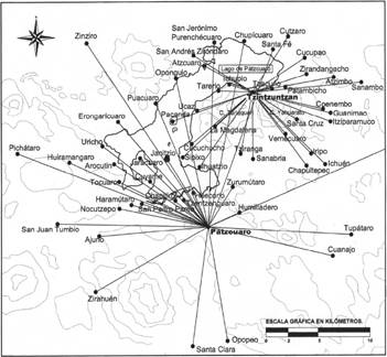 Al arribar los primeros españoles a Michoacán, los asentamientos humanos tenían un patrón disperso, generalmente dispuestos sobre las laderas de los cerros. Por su importancia y número de habitantes, únicamente Tzintzuntzan podía ser considerada como “ciudad” -aunque no en la concepción europea de lo que debía ser una ciudad ordenada-, el resto de las poblaciones eran de menor jerarquía y estaban compuestas de caseríos intercalados con parcelas de labranza (Castro, 2004, p. 75).