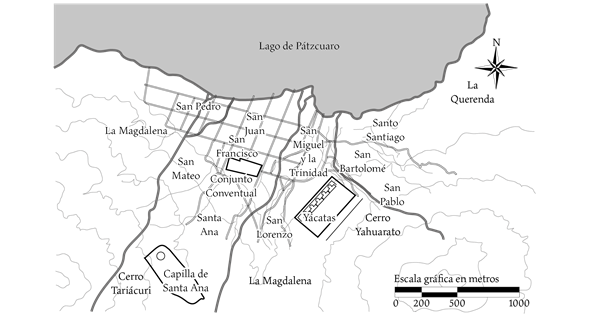 En 1593, después de décadas de lucha, Tzintzuntzan había dejado de ser sujeto de Pátzcuaro, al obtener el reconocimiento como ciudad con título y escudo de armas, mediante dos cédulas reales, una firmada el 3 de noviembre en San Lorenzo, que declaraba que Tzintzuntzan siempre había sido cabecera de la provincia, sede de los reyes y de la Corte tarasca, por lo que se mandaba ser gobernada “con policía y en forma de república bien ordenada”; la otra, signada el 22 de noviembre de 1593 en el Pardo, que le otorgaba independencia de Pátzcuaro y facultad para contar con gobernador propio (Beaumont, 1985, t. II, p. 250). Esto le permitía tener una jerarquía y privilegios que podía compartir con sus pueblos sujetos y los que fueran congregados. Dos años más tarde estaba en condiciones de elegir sus propios gobernadores, alcaldes, regidores, mayordomos, alguaciles y oficiales de república, así como tener su propia organización para cobrar el tributo real. Estas condiciones parecen haber motivado a organizar no sólo el manejo político administrativo de la ciudad, sino también la de los barrios sujetos, congregándolos en la cabecera. Coincide también con la fecha de terminación del último convento, cuya gestión se le atribuye a uno de sus guardianes: fray Pedro de Pila, que había llegado a convertirse en comisario general de los franciscanos en Nueva España.