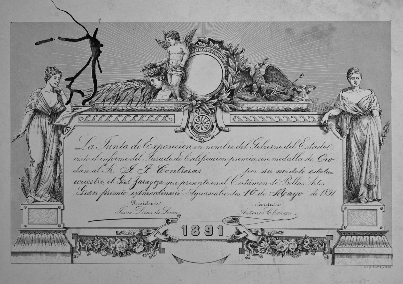 De hecho, en su ciudad natal, pocos años después la elite política, social y cultural le llegó a reconocer como un orgullo, por ser “hijo de Aguascalientes”, “aprovechado e inteligente” debido a sus capacidades, facultades y habilidades artísticas. Resulta que el joven Contreras, a la sazón estudiante en la ENBA, participó con varios trabajos en el certamen de la XXVIII Exposición de Industria, Minería y Artes del Estado de Aguascalientes, en abril de 1887; el jurado calificador le otorgó dos medallas, una de oro “por sus bajos relieves y demás objetos de bronce fundidos que presentó”, de “verdadero mérito”, y otra de plata “de primera clase” por “su busto retrato, tamaño natural, modelado en yeso”; esos premios, “bien merecidos”, dice la nota, fueron otorgados a “quien conquista el genio y la aplicación por el sendero del progreso, en el perfeccionamiento”, justamente en el ramo de las Bellas Artes.7