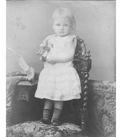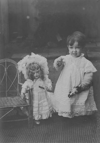 A su vez, los juguetes de las niñas (muñeca, casa de muñeca, vajilla) tenían por objetivo confortarlas en el espacio doméstico y acostumbrarlas a su futura función de esposa y madre. Verdadera dama en miniatura, la muñeca recibida por Amalia Errázuriz era lujosa, con un “cuerpo (…) de badana y color carne”, una “cara de porcelana blanca y rosada”, unos “ojos de cristal celeste” y un “cabello rubio verdadero” (Errázuriz, 1925, p. 18). Llamada Pelagia, en honor a la tía de Amalia, Pelagia Errázuriz Valdivieso, por el parecido de sus trenzas, la muñeca venía con un ajuar completo en una maleta, que incluía ropa interior en encaje de Valencienne, vestidos de muselina, seda y lana, sombreros, accesorios para peinarlas y joyas.13 Como se trataba sin embargo de un objeto de lujo más que de un verdadero juguete, se ordenó muy luego en su maleta y Amalia no pudo jugar con ella más que en ciertas ocasiones, lo que permitió la perennidad del objeto (Errázuriz, 1925, pp. 17-19).14 En una fotografía de circa 1905, que retrata una de las hijas del poeta y dramaturgo Manuel Magallanes Moure (1878-1924), se puede apreciar un ejemplo de este tipo de muñeca, con su vestido, sus inglesas con tocado de pluma y su abanico (véase imagen 2). Incluso algunas tenían un mecanismo que les permitían hablar, como la que le fue regalada a Carmen Lynch en 1891, que podía decir papá y mamá (Díaz, 2016, p. 72).