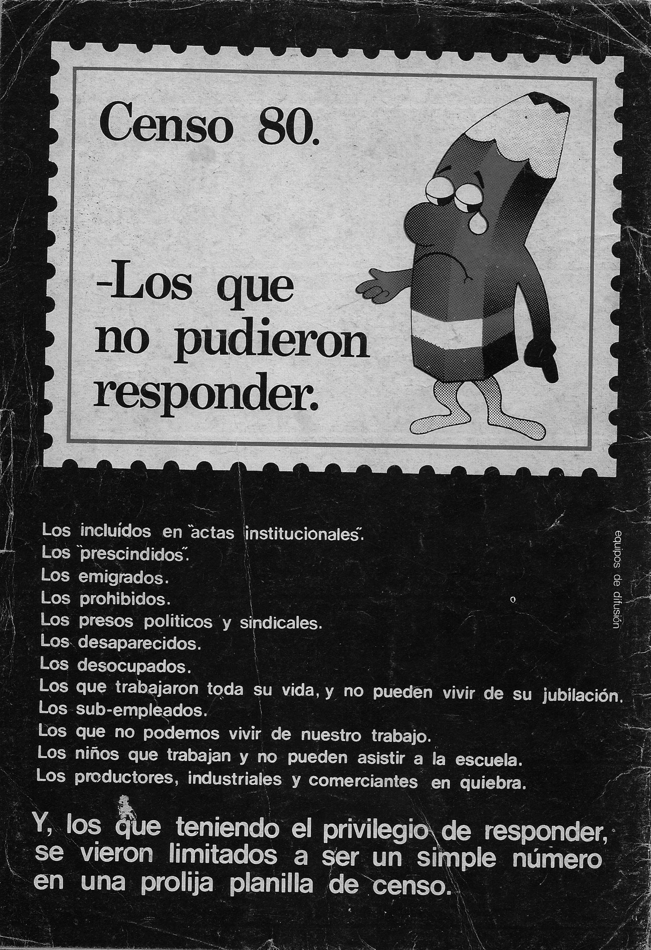 De acuerdo con lo anterior, en los primeros números, Línea no problematiza directamente la cuestión de las desapariciones forzadas de personas. Sin embargo, su instalación en la agenda mediática mantiene eco en ella, al integrar a los afectados por las políticas del régimen, como se desprendía de las declaraciones de monseñor Zazpe. Replican esta consideración dos menciones en las contraportadas, aplicadas a la sátira política similarmente a la de otras revistas como Humor. La primera apuntaba a cuestionar el realizado Censo Nacional de Población y Vivienda de 1980 y su publicidad (véase imagen 2).42