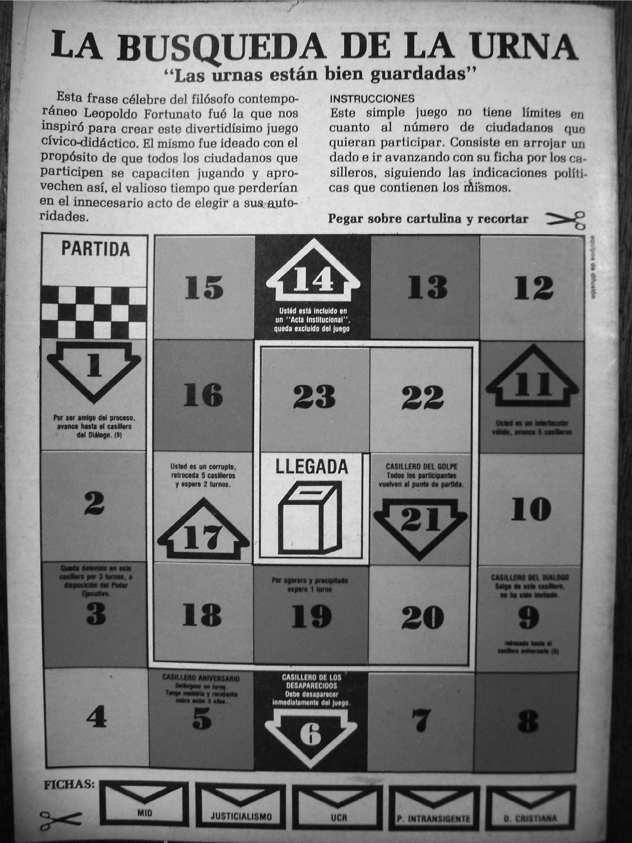 Una parodia del sello recibido como comprobante por los encuestados encabeza la composición, reemplazando la leyenda original “Yo respondí” por un “Los que no pudieron responder”. A esa viñeta le seguía una lista que mencionaba a los, para la revista, numerosos ausentes de la consulta y víctimas de sus políticas, entre ellos los desaparecidos. Casi un año después volvería a emplear el recurso, al mostrar la representación de un ficticio juego de mesa, inspirado en la declaración de una autoridad militar que descartaba la convocatoria a elecciones en el breve plazo.43 El entretenimiento contemplaba opciones (y constricciones) para los principales partidos participantes del “juego” político, personificados en fichas de jugador. Uno de los casilleros de penalidad en el trayecto planteado establecía: “Casillero de los desaparecidos. Debe desaparecer inmediatamente del juego.”44 Esta alternativa figuraba a un sujeto político presente por ausencia y recordaba que los militantes seguían bajo amenaza de la represión estatal. Pero, una vez más, esta forma de figurar la desaparición redundaba entre otras penalidades de un juego en cuya entidad metafórica se advertía el discreto nivel de relevancia concedida al tema y el énfasis dado a “reclamar la urna” como recuperación del sistema político republicano democrático (véase imagen 3).
