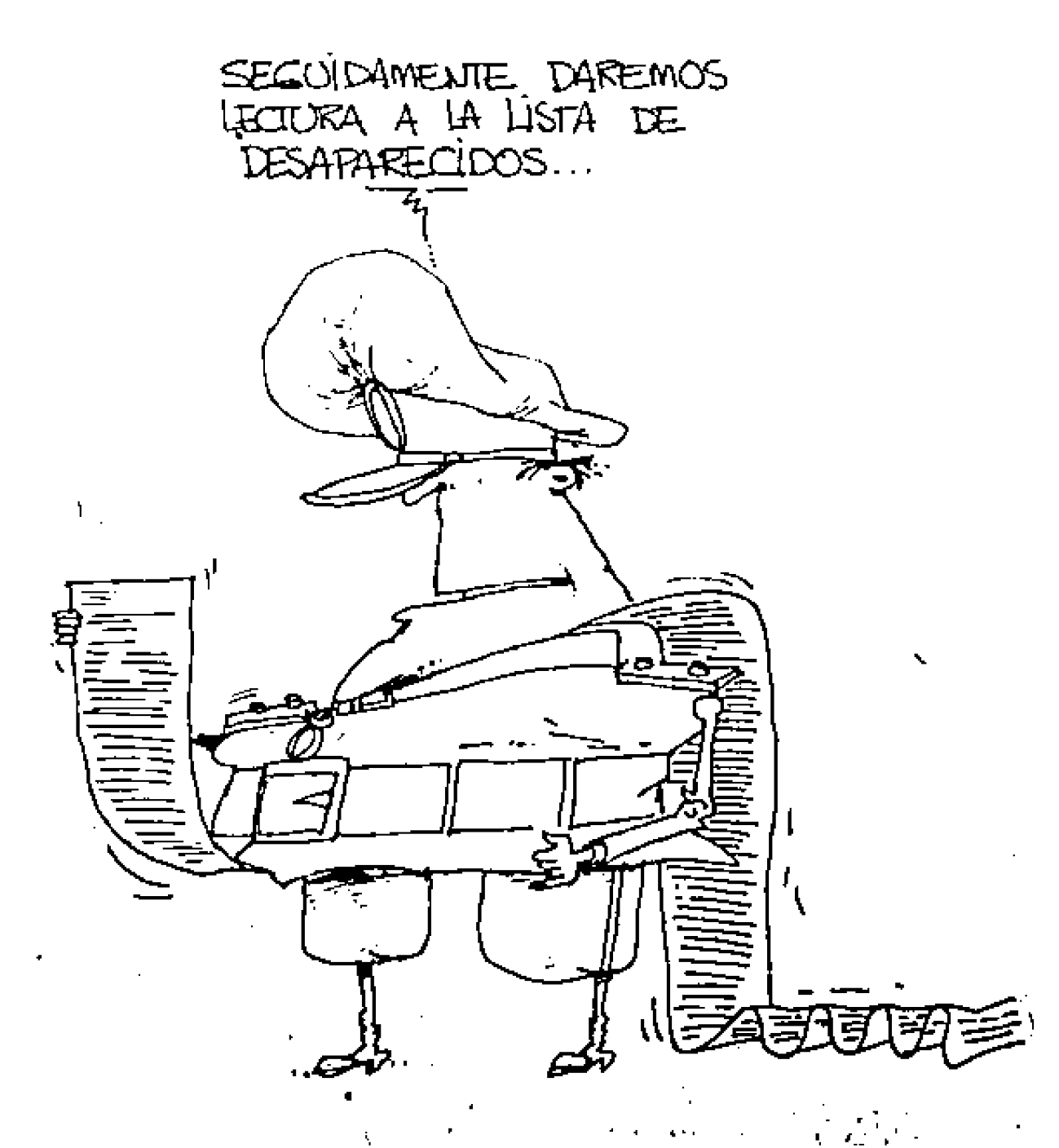 Asimismo, el humor gráfico que publica regularmente la revista en los meses finales de la dictadura muestra la tematización ocasional de las desapariciones forzadas. Un chiste de Beas satiriza las versiones sobre la difusión oficial de listas de desaparecidos, exigida reiteradamente por el movimiento de derechos humanos. Su trama asemeja la condición de las víctimas a la truculencia de los rumores sobre la existencia de tales listados y la consiguiente posibilidad de su difusión oficial (véase imagen 4). Otro chiste posterior retoma el tópico de las listas, esta vez en torno a la presunción de su extensa cuantía (véase imagen 5). Ambos chistes, por lo demás, cobran relieve en función de la presencia de la cuestión de las listas en la agenda mediática, en tanto las notas con las que comparten espacio no la mencionan en absoluto.