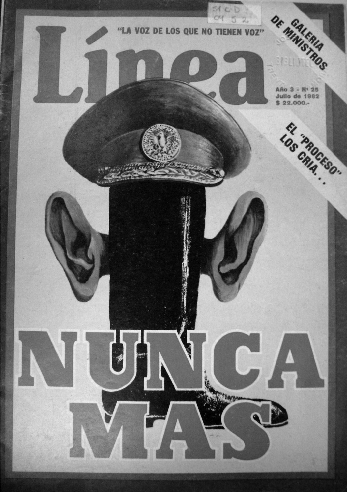 Sin embargo, Línea suministra un claro antecedente alternativo de uso público del lema en una portada con similar connotación emblemática; es decir, con intención de condensar y estabilizar una significación sobre el pasado (Feld, 2009, p. 100), pero inscrita en el discurso político coyuntural. En ella se sintetizan componentes estereotipados del atuendo militar, combinados con los atribuidos al exministro Martínez de Hoz, símbolo de las políticas neoliberales de la dictadura. La bota de caña alta -ya empleada en otra portada para simbolizar la opresión castrense- y la gorra de uniforme aparecen unidas a las grandes orejas omnipresentes en toda caricatura del funcionario -estandarizada a partir de su representación en otras publicaciones contemporáneas, como la célebre Humor-.54 El anclaje imagético lo constituye el titular en tipografía catástrofe “Nunca más”, con intenciones admonitorias evidentes.