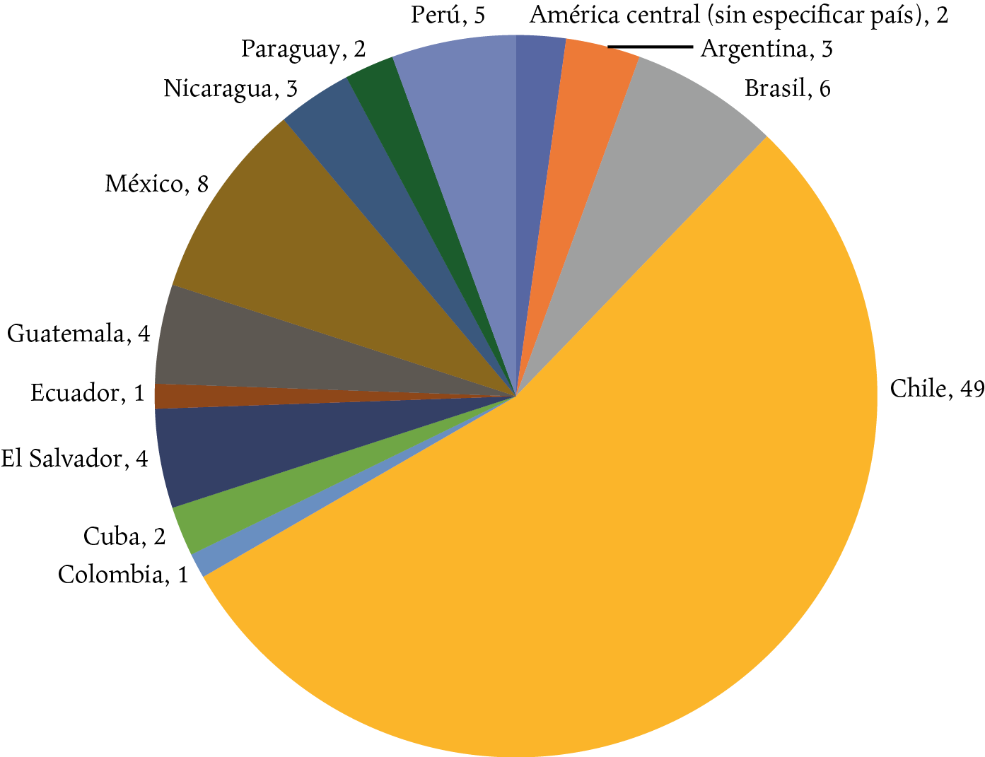 Tras estas consideraciones, elaboramos una nueva base de datos en File Maker y en Excel donde incluimos la información del registro original junto con datos a partir de nuestras observaciones.9 El producto de esta base se muestra en la gráfica 1, que identifica el número de carteles por país con el que Francia establece acciones solidarias.