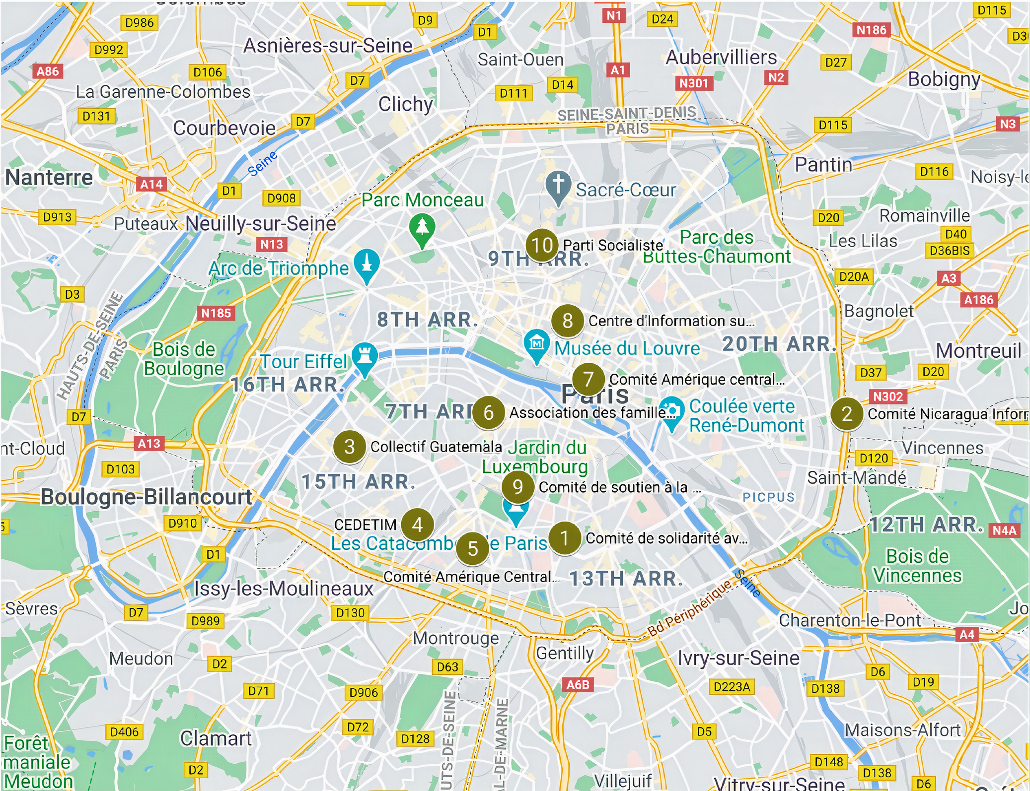 Comité de Solidarité Avec la Lutte du Peuple de El Salvador. 45, bis rue de la Glacière, Paris, 75013. Comité Nicaragua Information. Avenue Benoît Frachon, 75020 Paris, France. Collectif Guatemala. 67 Rue du Théâtre, 75015 Paris, France. Centre d’Études et d’Initiatives de Solidarité Internationale (CEDETIM). 14, rue Nanteuil. Comité Amérique Centrale du 14e. 35, rue Olivier Noyer, 75014 Paris. Association des Familles des Disparus. 18, rue de Varenne, 75007, Paris. Comité Amérique Central Oscar Romero/Église Saint Merri. 78 Rue Saint-Martin, 75004 Paris, France. Centre d’Information Sur la Lutte Anti-impérialiste CILA. 17 Rue du Sentier, 75002 Paris, France. Comité de Soutien à la Lutte Révolutionnaire du Peuple Chilien. 94 Rue Notre Dame des Champs, 75006 Paris, France. Parti Socialiste. 12 Cité Malesherbes, 75009 Paris, France.