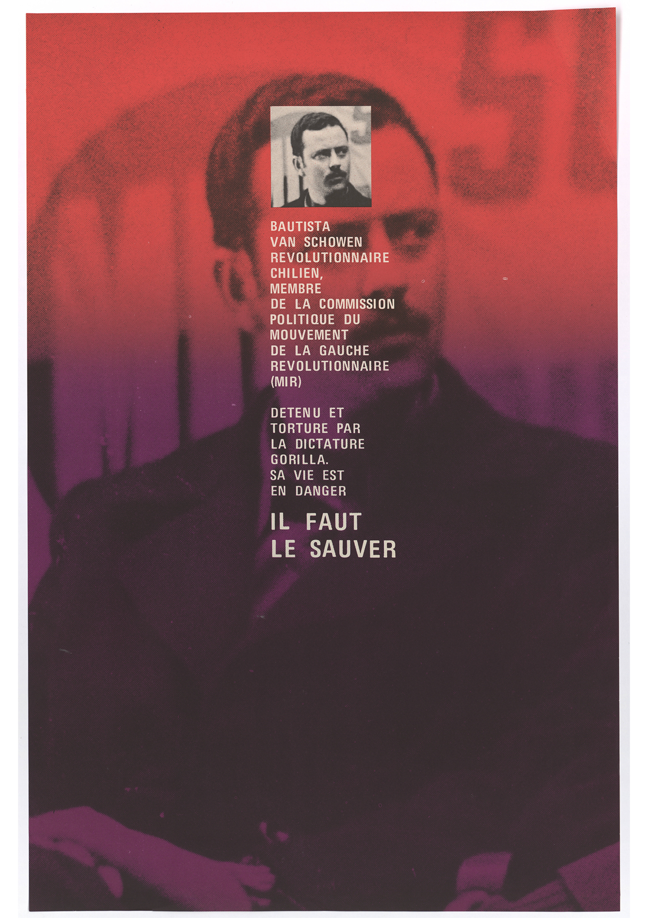 Los carteles del MIR chileno son más enfáticos en el binomio rojo-negro, lo que da a sospechar empatía con estéticas anarquistas. De orientación marxista-leninista, el MIR fue uno de los más radicales opositores a la dictadura de Pinochet. Durante su exilio francés, el Movimiento lanzó una agresiva propaganda para reclamar por la desaparición de su líder Bautista van Schouwen, detenido por la DINA en Chile, en diciembre de 1973.36 Un cartel lo muestra difuminado -una imagen que en su origen fue fotografía- coloreada en rojo, negro y violeta (véase imagen 5). Esta fórmula sugiere un guiño con el arte pop y las composiciones multicromáticas de Andy Warhol, también presentes en otros carteles políticos, independientemente de su orientación.