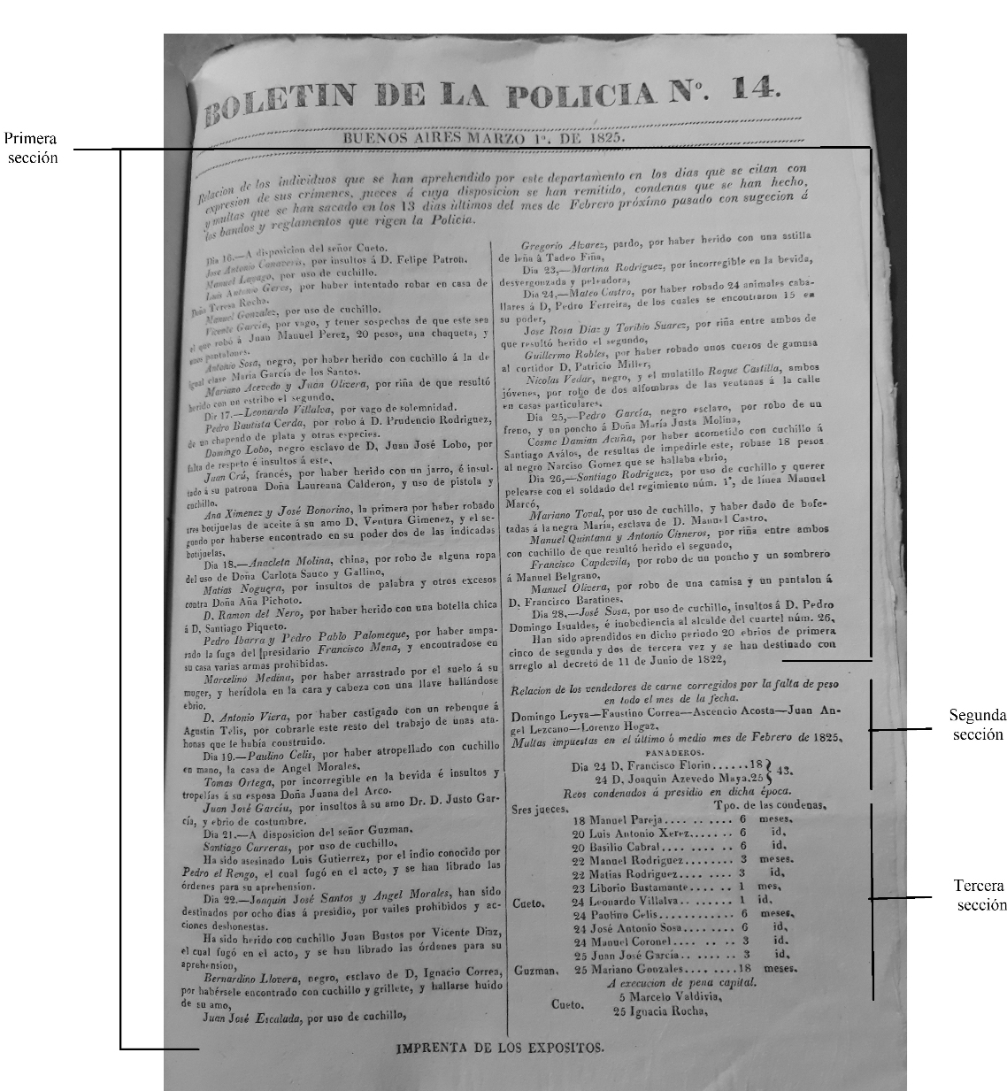 Fuente: Intervención propia sobre Boletín de la Policía, núm. 14, 1 de marzo de 1825. Fondo Real Audiencia. Cámara de Apelaciones. Sección Papeles Sueltos. C. 7, A. 4, L. 9, exp. 27. Archivo Histórico de la Provincia de Buenos Aires (AHPB), Argentina