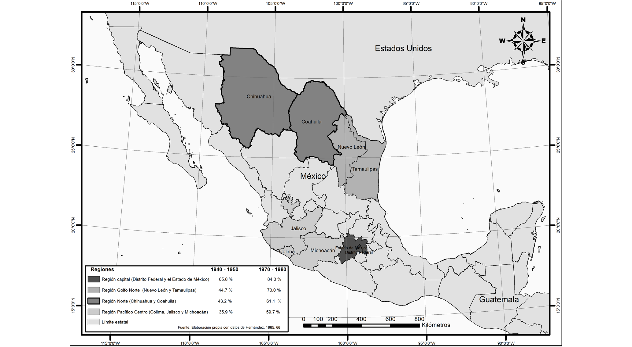 Fuente: elaboración propia basada en la integración de regiones con desarrollo industrial para el periodo de estudio de Hernández (1983, p. 66)