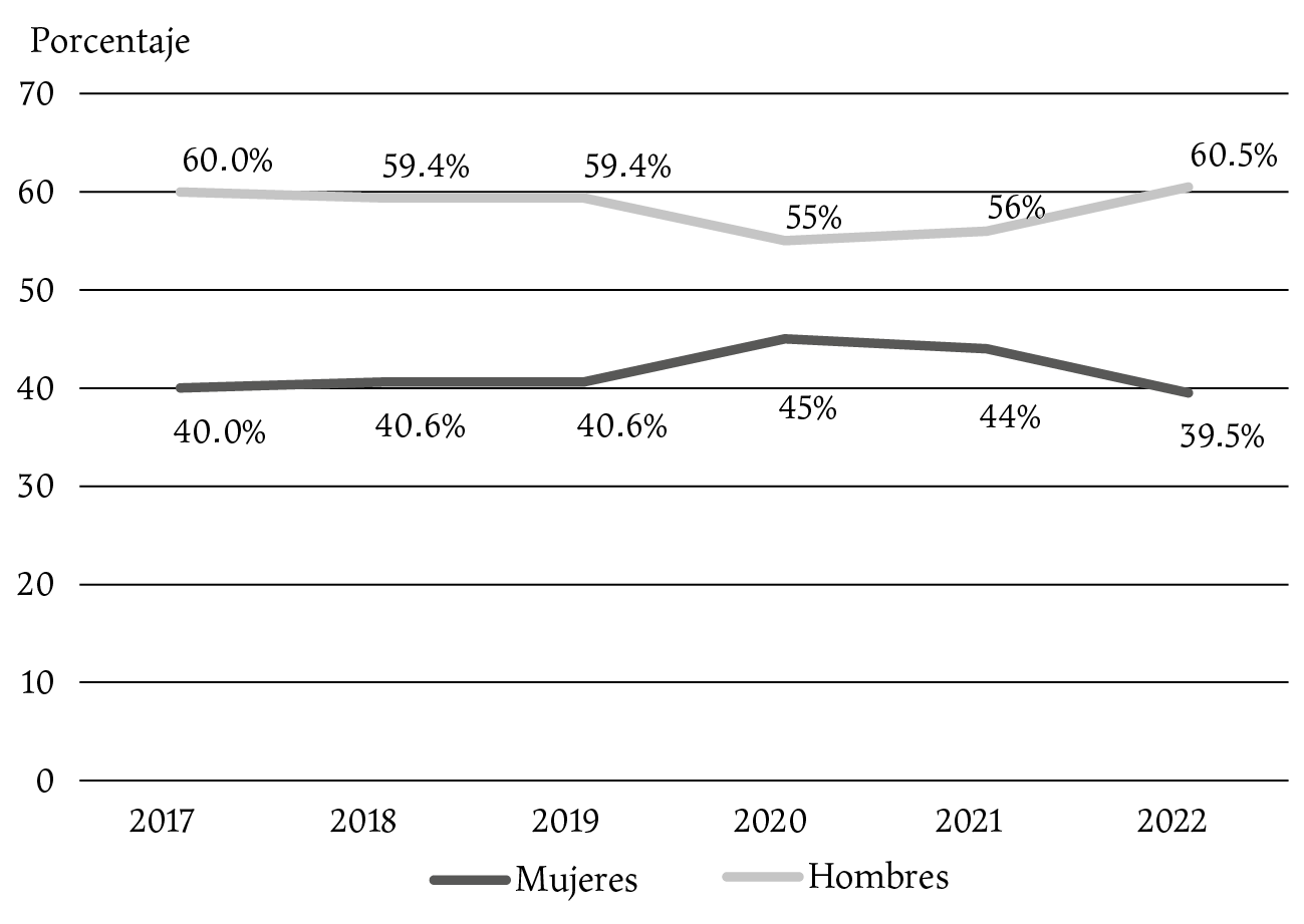 El porcentaje de mujeres entre las personas ocupadas en la industria audiovisual comenzó a reportarse en 2017. Desde entonces, se acelera su inclusión hasta 2022, pero en ese año la participación se reduce a niveles de 2017, como indica la gráfica 2.