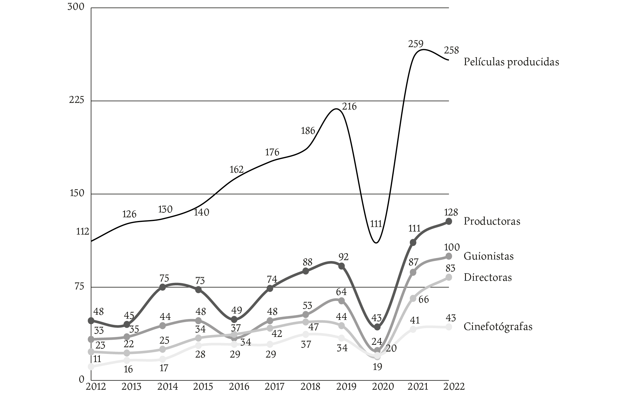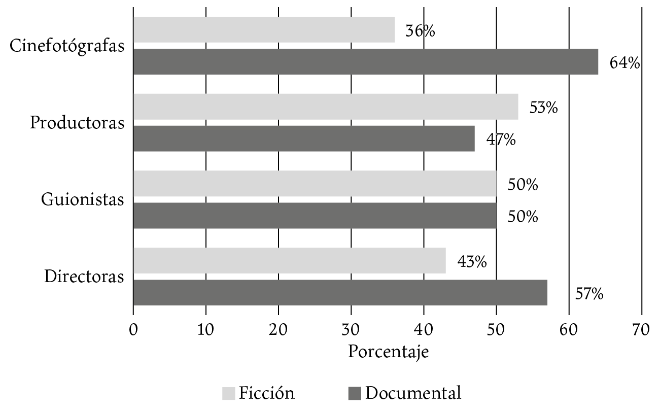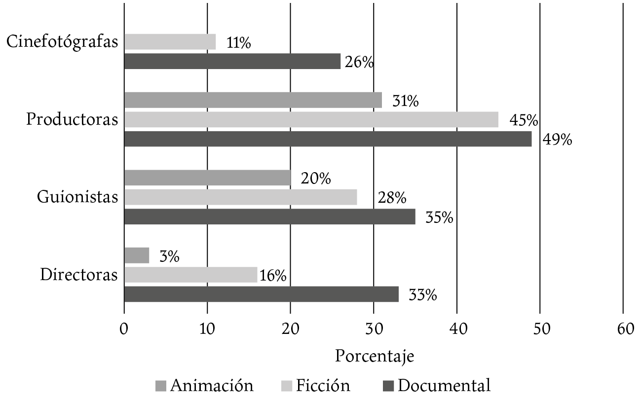 La edición de 2020 incluye una sección especial dedicada al papel de las mujeres en la cinematografía nacional y ofrece un apartado para visibilizarlo, pero la información continúa siendo limitada. Las estadísticas se refieren a las actividades de dirección, producción, guion y, recientemente, cinefotografía, vinculadas a la producción de largometrajes. Sin embargo, a diferencia de los estudios europeos (Asociación de Mujeres Cineastas y de Medios Audiovisuales [CIMA], 2022, 2023; Observatorio Audiovisual Europeo, 2022), no recopilan datos sobre el resto de las categorías profesionales.