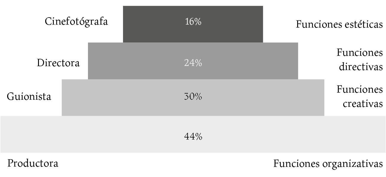 En el caso de México, el informe de Ivanov et al. (2021) apunta que se perciben niveles de introducción femenina en la industria similares a mercados como España, Argentina o Brasil. Existe una subrepresentación en las funciones de liderazgo creativo y no por falta de profesionales cualificadas, ya que la presencia de mujeres en las escuelas de cine sí está equilibrada. En dirección y guion no se supera el 30% de representación (Ivanov et al., 2021, p. 16) y se vincula a la mujer con proyectos de menor presupuesto; se roza el equilibrio en producción y dirección de arte y existe sobrerrepresentación femenina en las funciones de vestuario y peluquería/maquillaje, reproduciendo el sector los estereotipos existentes en la sociedad sobre el papel de las mujeres. En las áreas técnicas, como sonido, dirección de fotografía, composición musical y efectos especiales (VFX), el crecimiento de la participación femenina parte de bases muy reducidas y avanza muy lentamente.