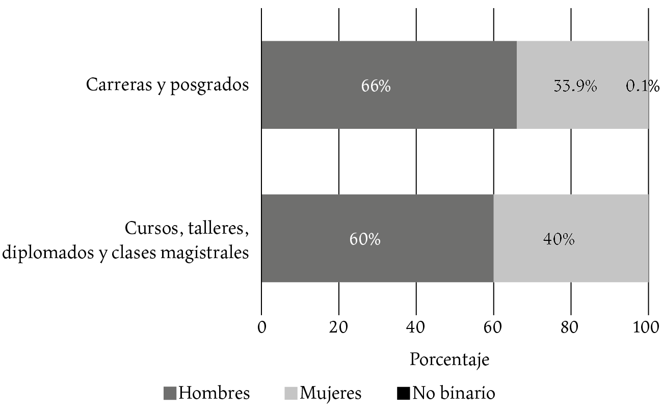 Con esto se logró un avance en la igualdad de oportunidades para las mujeres que buscan cualificarse para insertarse en la industria, pero no existe ninguna medida similar referida a los formadores. IMCINE, para 2022, reportó actividades formativas (cursos de grado, posgrado, talleres, clases magistrales, etc.) que en 37.9% de los casos fueron impartidas por mujeres, como refleja la gráfica 9.