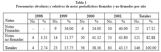 Además, es en los años 2000 y 2001 donde se concentran el mayor número y porcentaje de las notas informativas, respectivamente 52 (39.69%) y 58 (44.28%); entre ambas suman el 83.97% o, lo que es lo mismo, por cada nota de los otros géneros (reportaje, entrevista, artículo de opinión, editorial, columna, inserción, crónica, reseña y ensayo), 8.39 corresponden a notas informativas. En estos mismos años, las notas de los demás géneros, aunque en términos relativos resulten significativas en algunos casos, en números absolutos son prácticamente irrelevantes. La tabla 1 muestra la distribución real y porcentual de las notas según si aparecían o no firmadas.