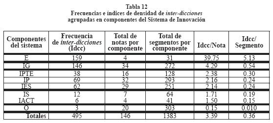 En términos generales, por cada nota del corpus aparecen 3.39 invocaciones a los diversos componentes del Sistema de Innovación; por cada segmento aparecen 0.36 invocaciones. En cuanto a lo particular, se observa que son más densas las inter-dicciones de los componentes del sistema con respecto a las empresas, que destacan por sobre todas las demás (por cada nota hay casi 40 inter-dicciones y por cada segmento poco más de 5; luego siguen las de las instituciones gubernamentales; un tercer bloque está encabezado sorprendentemente por las instituciones puente (por cada nota 2.38 inter-dicciones y por cada segmento 0.30) y luego las de la iniciativa privada y las educativas; un cuarto bloque por las instituciones sociales y del área científico-tecnológica; y un último bloque por los sujetos sin representación institucional.