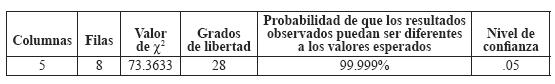 cuadrada para la hipótesis 2, al nivel de confianza de .05, fue de 322.9725, mayor que el valor promedio esperado de 64.59. Se aceptó la hipótesis de investigación porque la correlación es significativa.