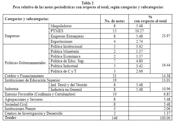 Las categorías "gruesas" fueron derivadas del propio flujo de la información. Un ejemplo de esta derivación se observa en la categoría Empresas, que recoge la frecuencia de los casos en que los encabezados hablan sobre noticias relacionadas con las empresas, en las subcategorías Maquiladoras, PyMES, Empresas Extranjeras y Exportaciones de las empresas, y así sucesivamente en las demás categorías. La tabla 2 muestra la distribución de frecuencias y porcentajes de las notas según categorías "gruesas".