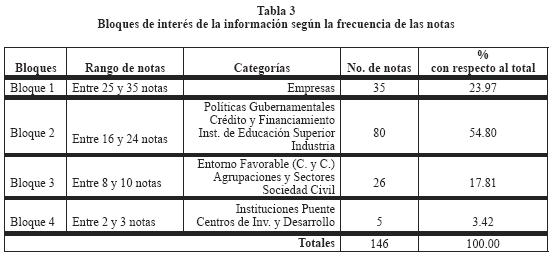 Mientras que las frecuencias en las categorías Instituciones Puente y Centros de Investigación y Desarrollo resultan muy menores, conformando un cuarto bloque de interés del discurso informativo. La tabla 3 muestra esta nueva estructuración en bloques: