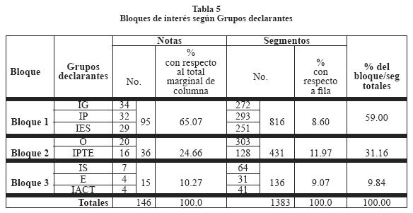 La tabla 5 muestra que entre IG, IP e IES se concentra el 65.07% de las notas; es decir, por cada nota de las demás subcategorías aparecen 6.5 de aquellas tres (más de dos terceras partes). Casi la cuarta parte corresponde a O e IPTE, y tan sólo una décima parte se reparte entre IS, E e IACT. Ordenando los datos por bloques, se observa lo siguiente (ver tabla 5).
