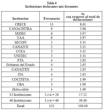 En relación con esta categoría, se prefirió omitir la subcategoría "sujeto declarante" por considerarse que reviste menor interés que la institución a la que cada sujeto representa. Los resultados se presentan en la tabla 6.